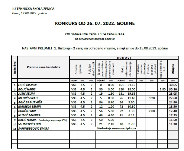 Preliminarne liste kandidata – KONKURS I OGLAS od 26.07.2022.godine